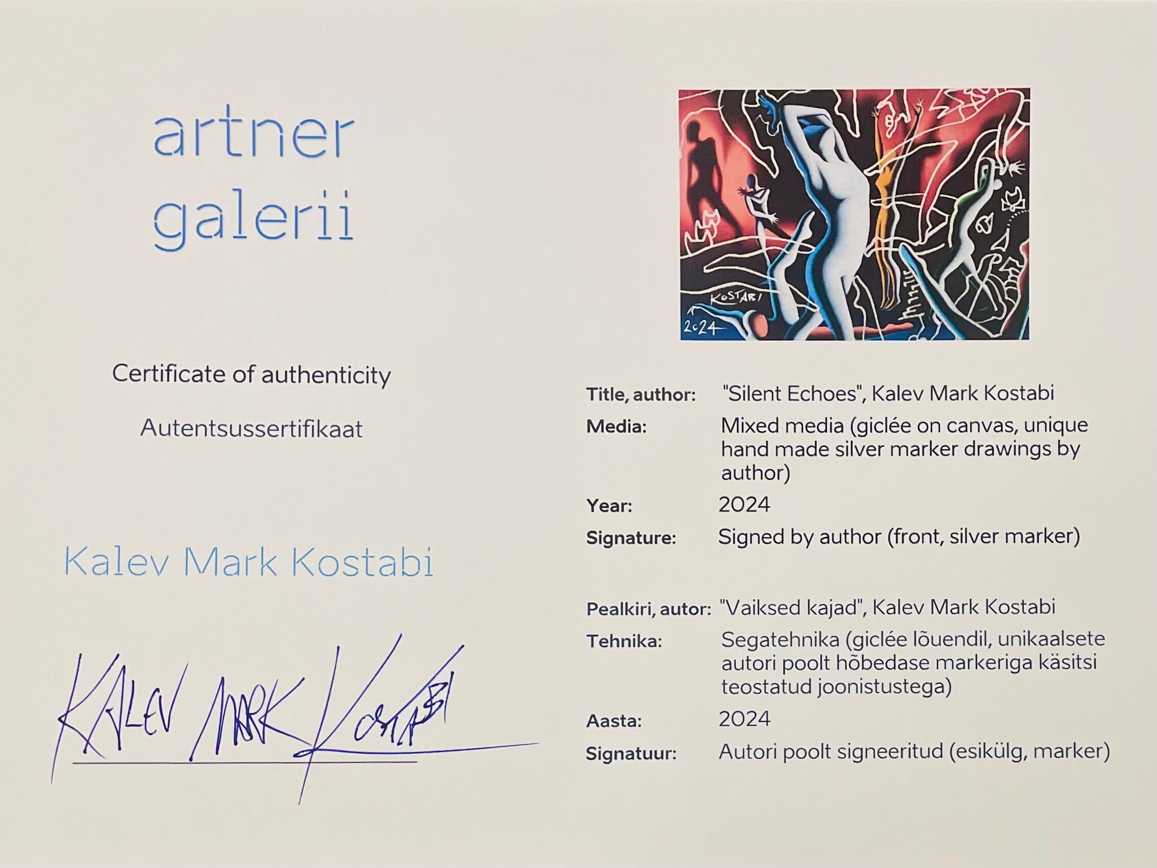 Segatehnika (giclée lõuendil, unikaalsete Kalev Mark Kostabi poolt käsitsi teostatud joonistustega). Signeeritud, dateeritud. Autentsussertifikaat autorilt.